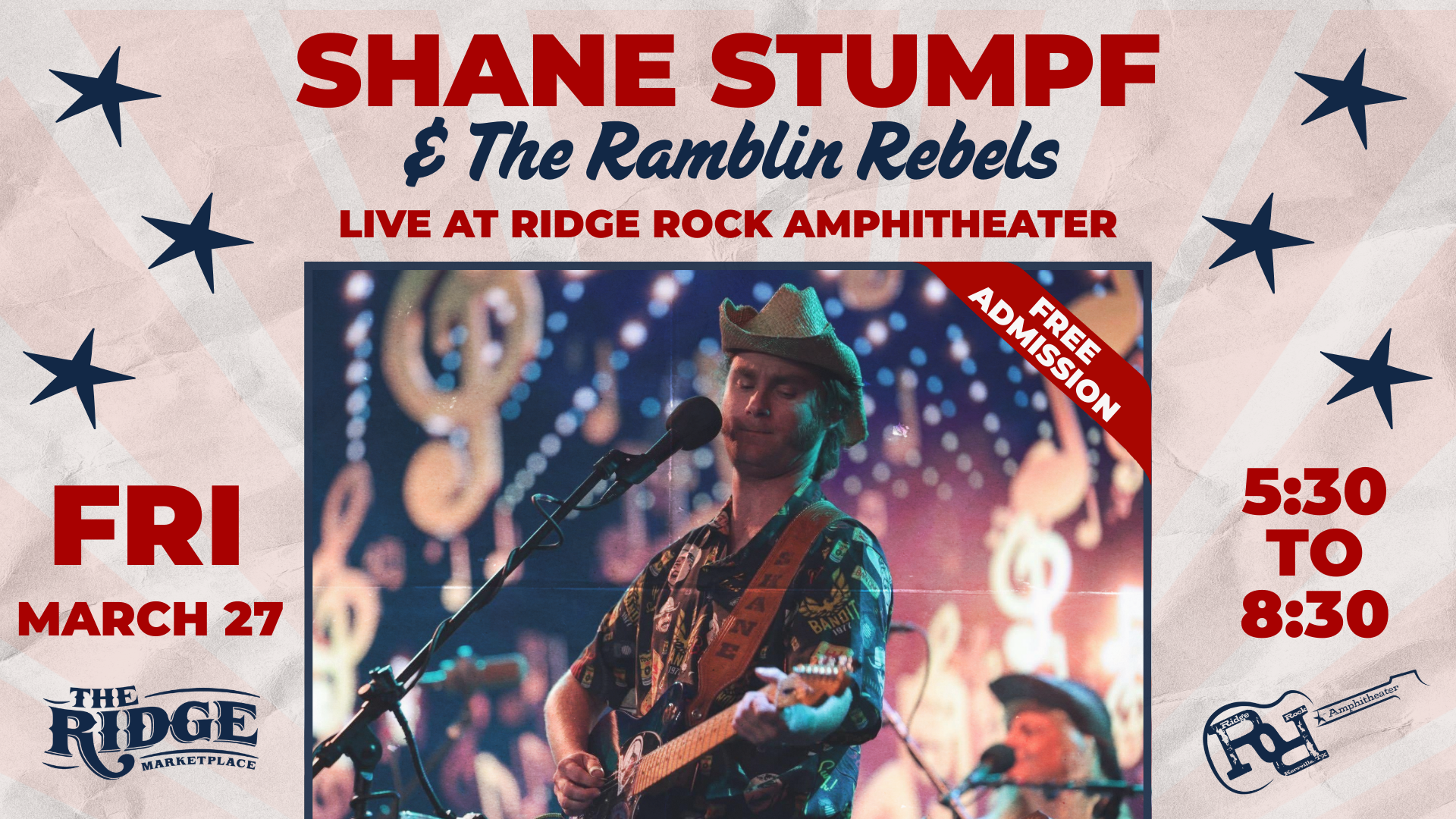 Ridge Rock Amphitheater 13439 S. Ranch Road 783, Kerrville, United StatesJoin us at The Ridge Marketplace in Kerrville, Texas for an evening of live music with Shane Stumpf & The