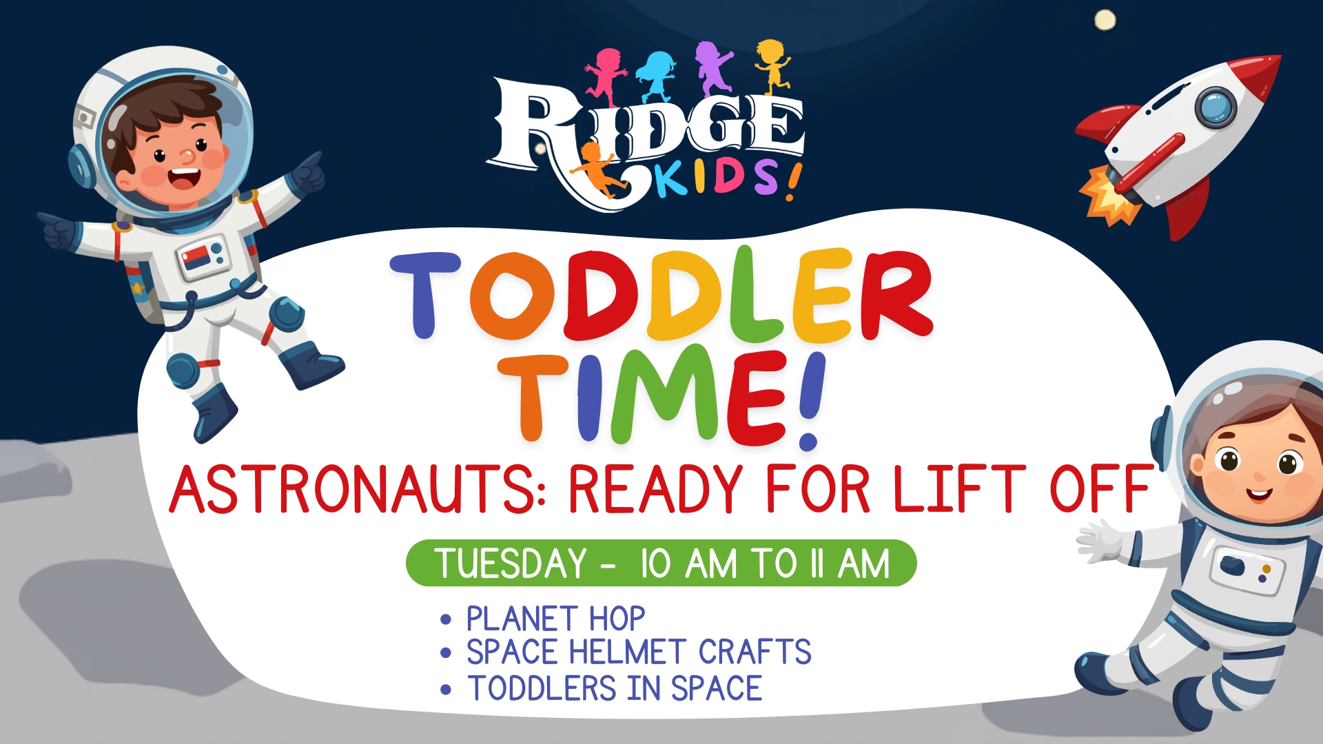 Cafe at the Ridge 13439 S. Ranch Road 783, Kerrville, TX, United StatesJoin us for a fun and engaging morning at Toddler Time: Astronauts – Ready for Lift Off at The Ridge