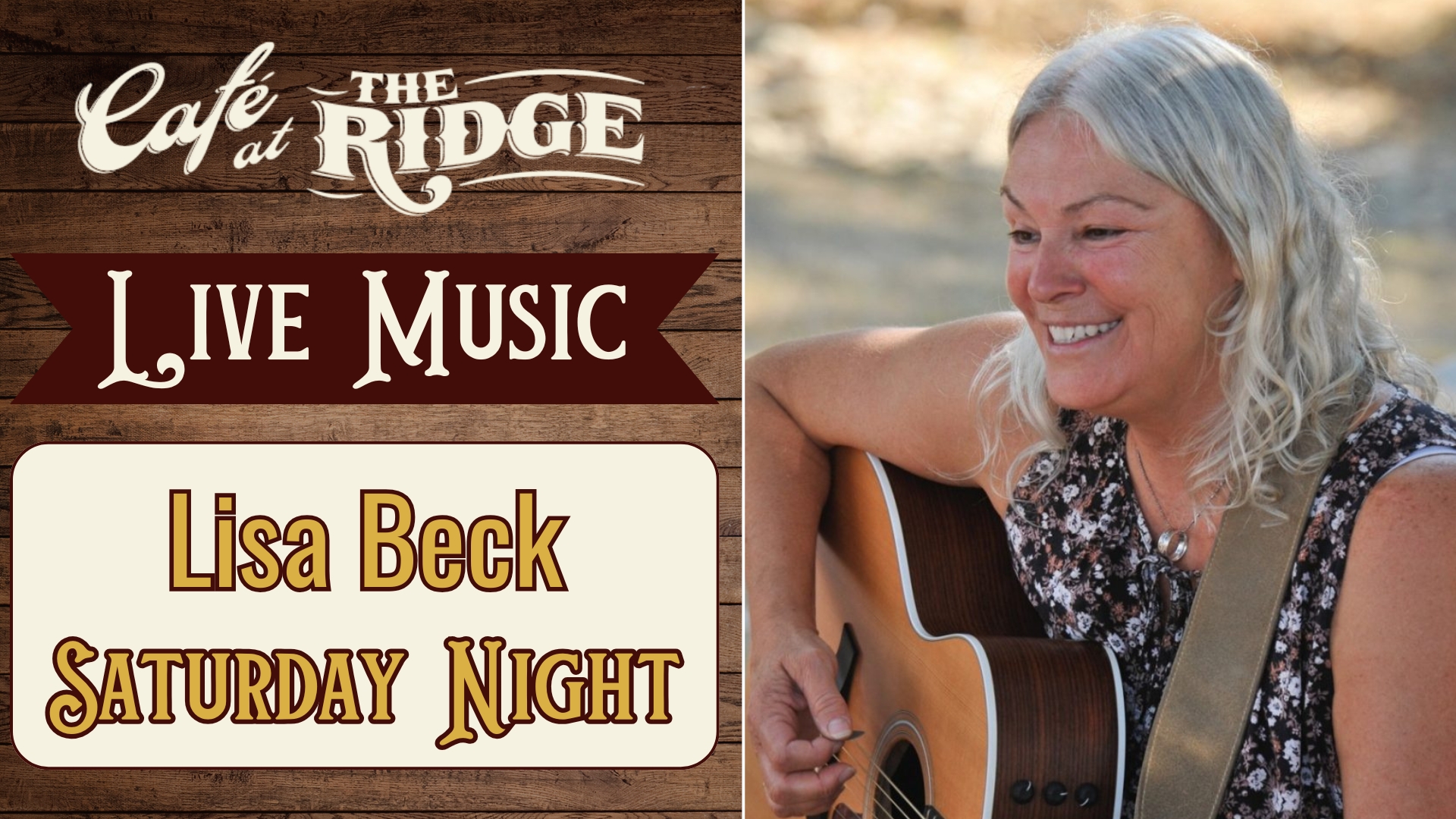 Cafe at the Ridge 13439 S. Ranch Road 783, Kerrville, TX, United StatesCome and enjoy an evening of enchanting live music by the talented Lisa Beck at Cafe at the Ridge. While